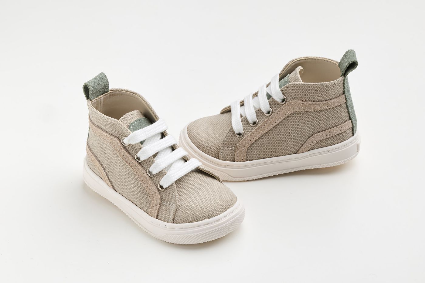 A633E - μποτάκι περπατήματος σε μπεζ ύφασμα και λεπτομέρεια από μπεζ και μέντα καστόρ δέρμα