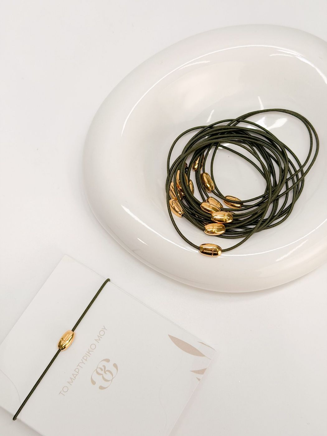 Μαρτυρικό βραχιόλι με ελαστικό κορδόνι σε χακί και επιχρυσωμένο σταυρό.