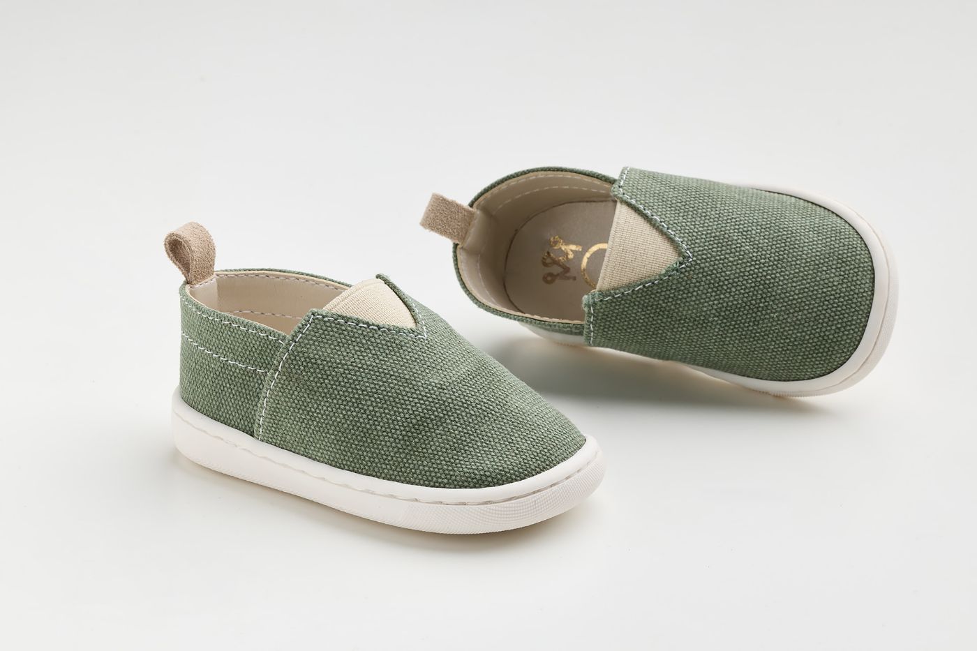 Παπουτσάκι - εσπαντρίγια σε λαδί καμβά, καστόρ δέρμα και λάστιχο για τα πρώτα βήματα του μωρού σας
