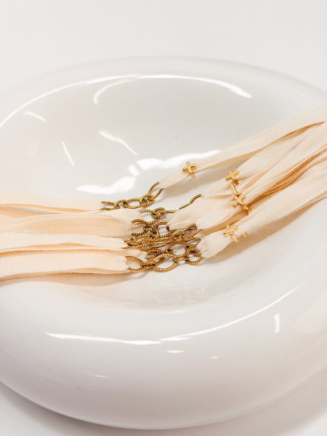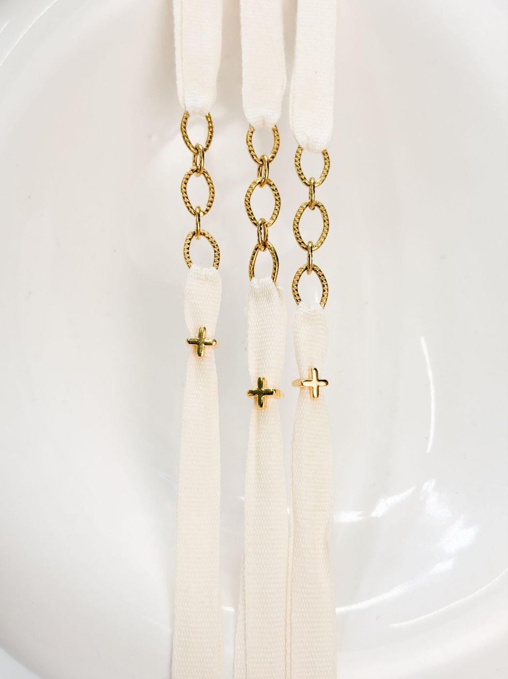 Μαρτυρικό βραχιόλι με εκρού κορδέλα, αλυσίδα στην μέση και επιχρυσωμένο σταυρό.