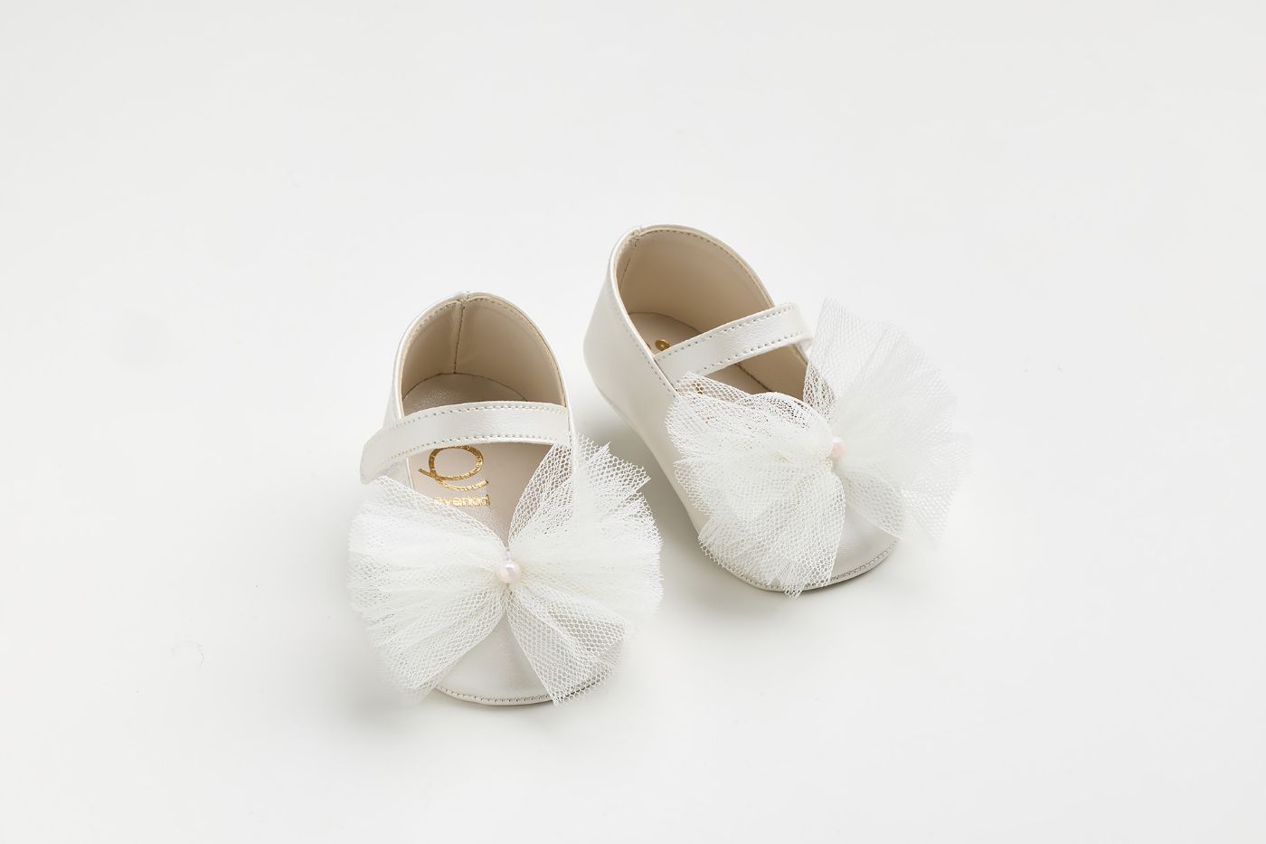 K602A - Μπαλαρίνα αγκαλιάς σε εκρού τεχνόδερμα με χειροποίητο τούλινο φιόγκο σε off white