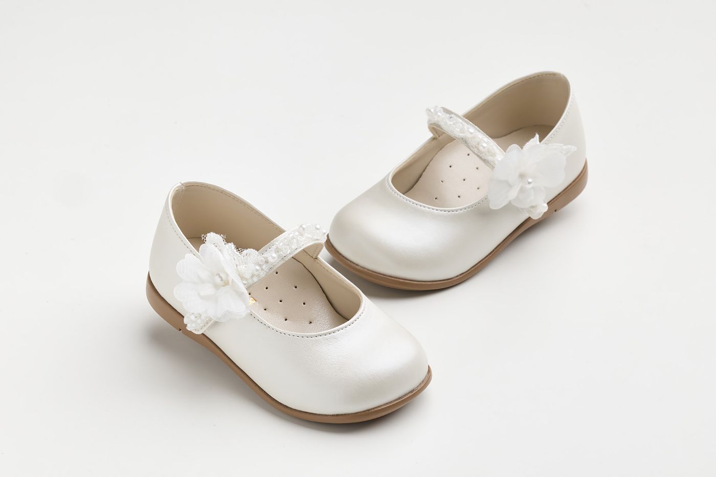 K6102E - Μπαλαρίνα περπατήματος σε εκρού τεχνόδερμα με πέρλες και λουλούδι στην μπαρέτα