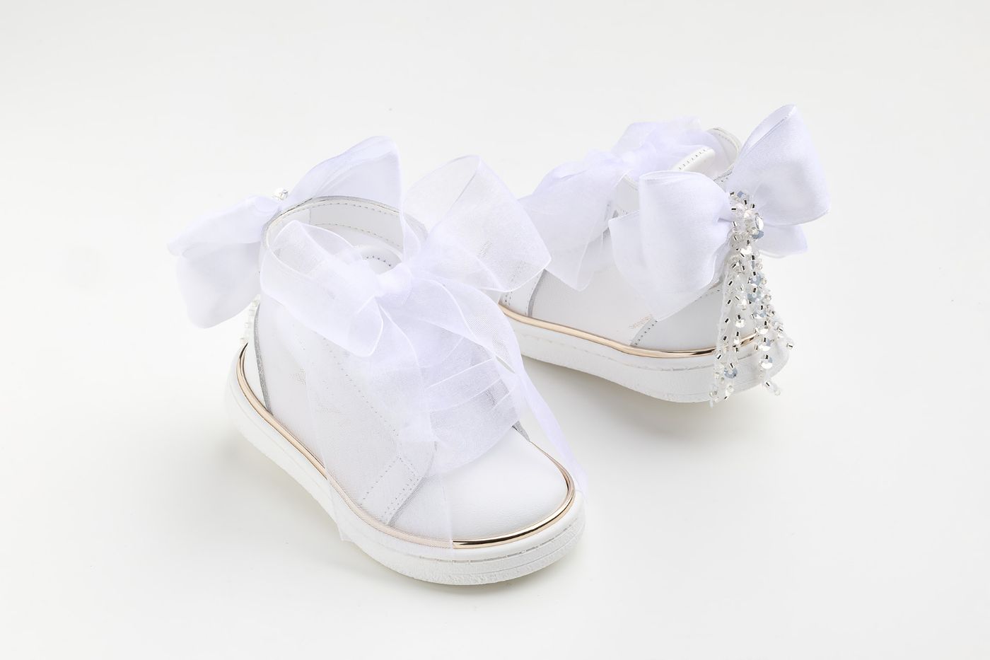 Μποτάκι περπατήματος σε λευκό δέρμα και διαφάνεια, διακοσμημένο με χειροποίητο σατέν φιόγκο και παγιέτες