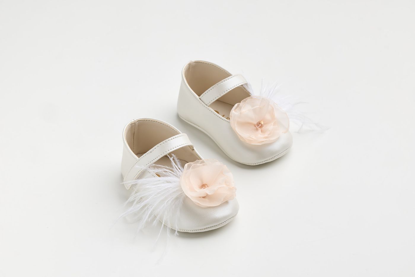 K618B - Μπαλαρίνα αγκαλιάς σε εκρού τεχνόδερμα με χειροποίητο σομόν λουλούδι και φτερά