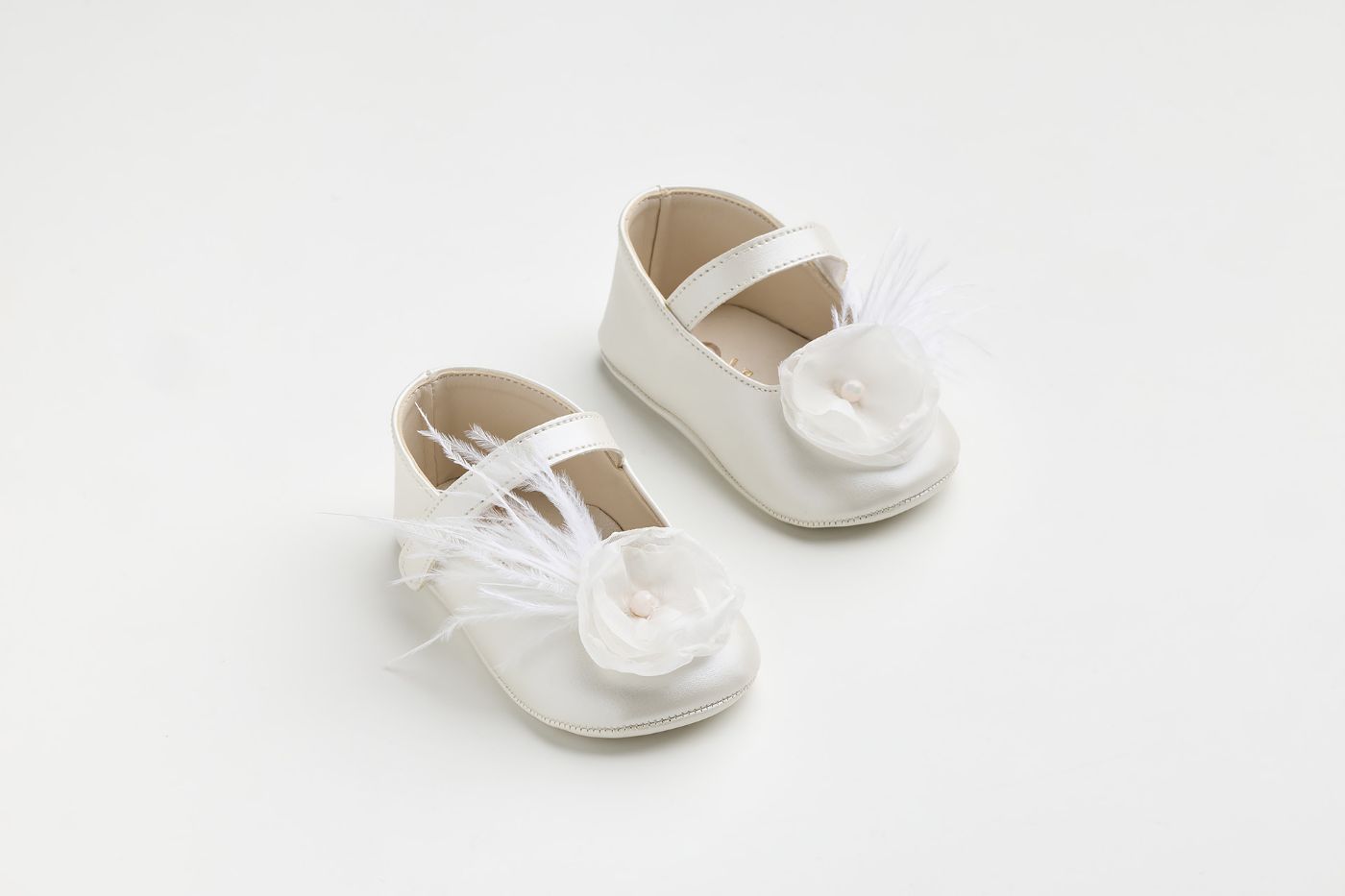 K618E - Μπαλαρίνα αγκαλιάς σε εκρού τεχνόδερμα με χειροποίητο off white λουλούδι και φτερά