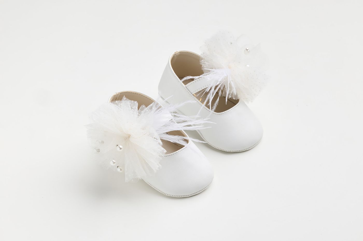 Μπαλαρίνα αγκαλιάς σε λευκό τεχνόδερμα με χειροποίητο διακοσμητικό από off white πουά τούλι πέρλες και φτερά