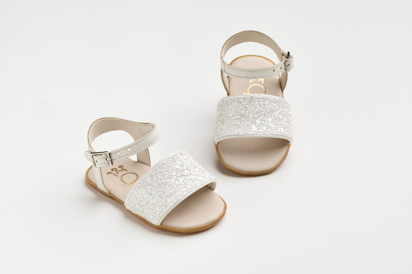 Σανδάλι για τα πρώτα βήματα σε εκρού ματ γκλίτερ και εκρού δέρμα