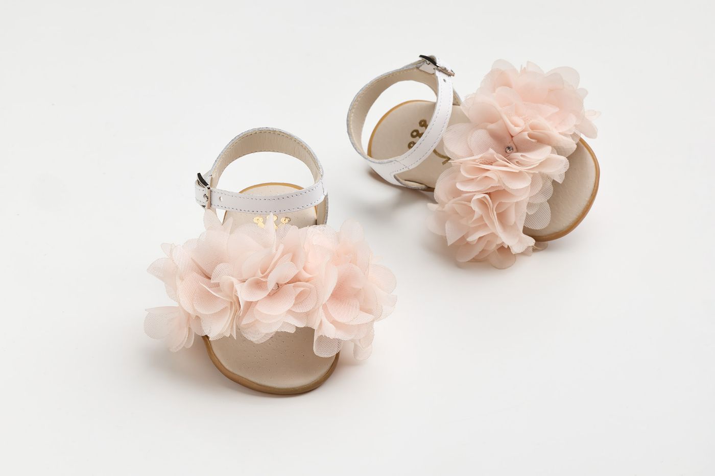 Σανδάλι για τα πρώτα βήματα σε λευκό δέρμα και χειροποίητο σομόν διακοσμητικό
