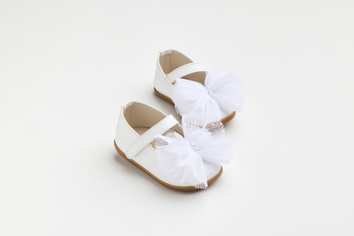 K629A - Μπαλαρίνα για τα πρώτα βήματα σε λευκό τεχνόδερμα με χειροποίητο φιόγκο από λευκό πουά πλισέ τούλι