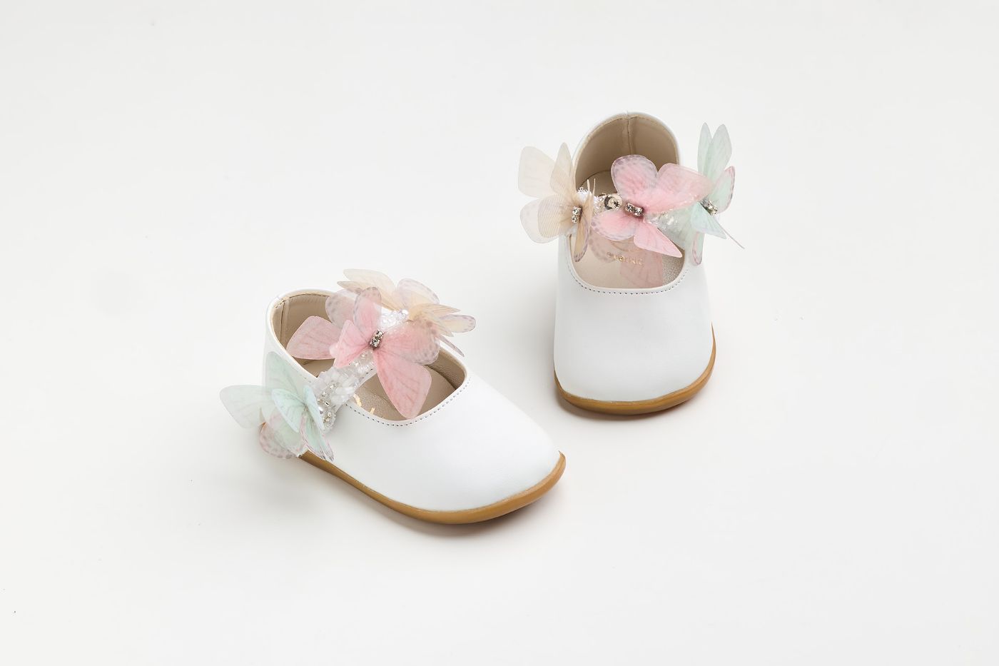K633A - Μπαλαρίνα για τα πρώτα βήματα σε λευκό τεχνόδερμα διακοσμημένο με χάντρες, πεταλούδες και στρας