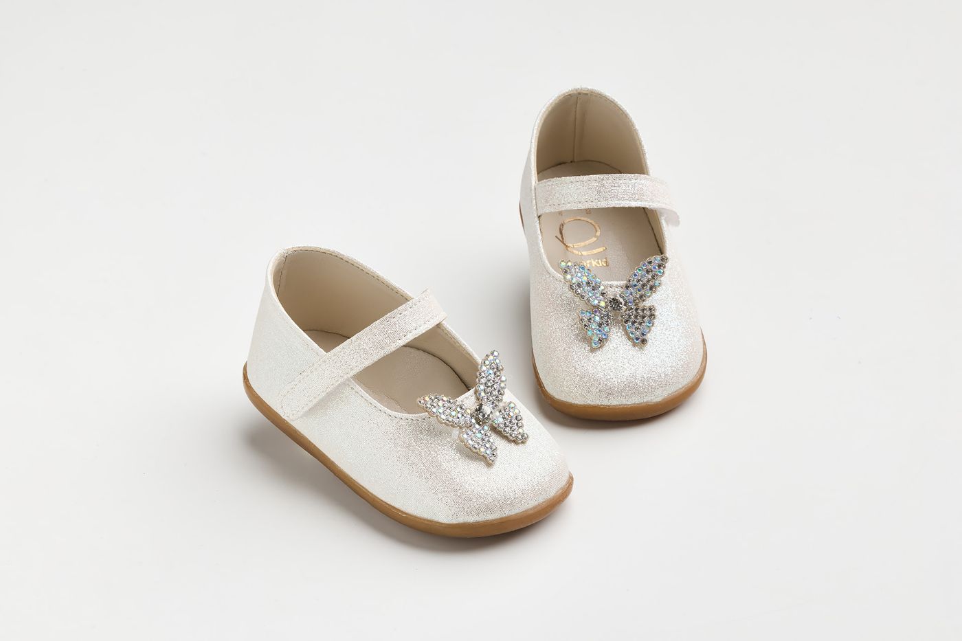 K637E - Μπαλαρίνα για τα πρώτα βήματα σε λευκό ασημί γκλίτερ με στρας πεταλούδα