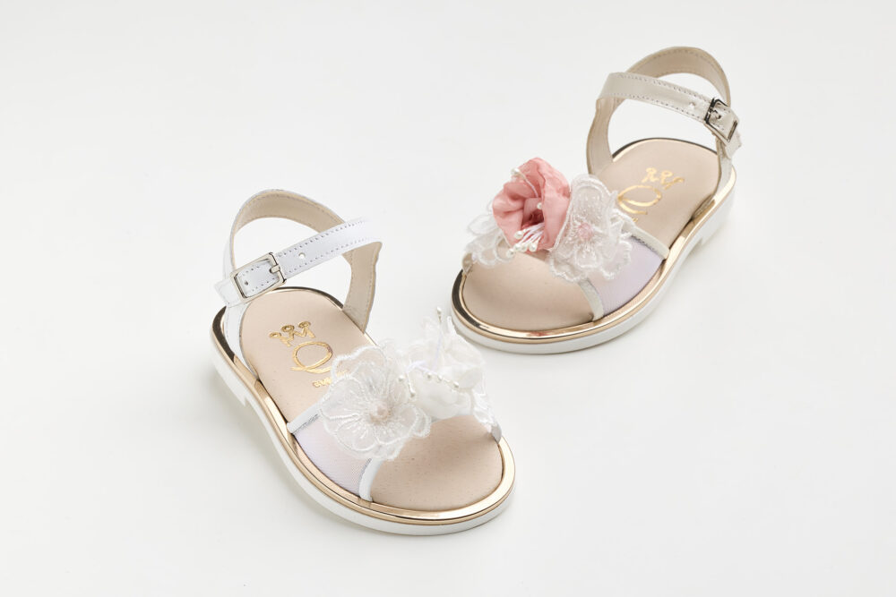 K645A - Σανδάλι περπατήματος σε λευκό δέρμα και διαφάνεια με χειροποίητα off white λουλούδια