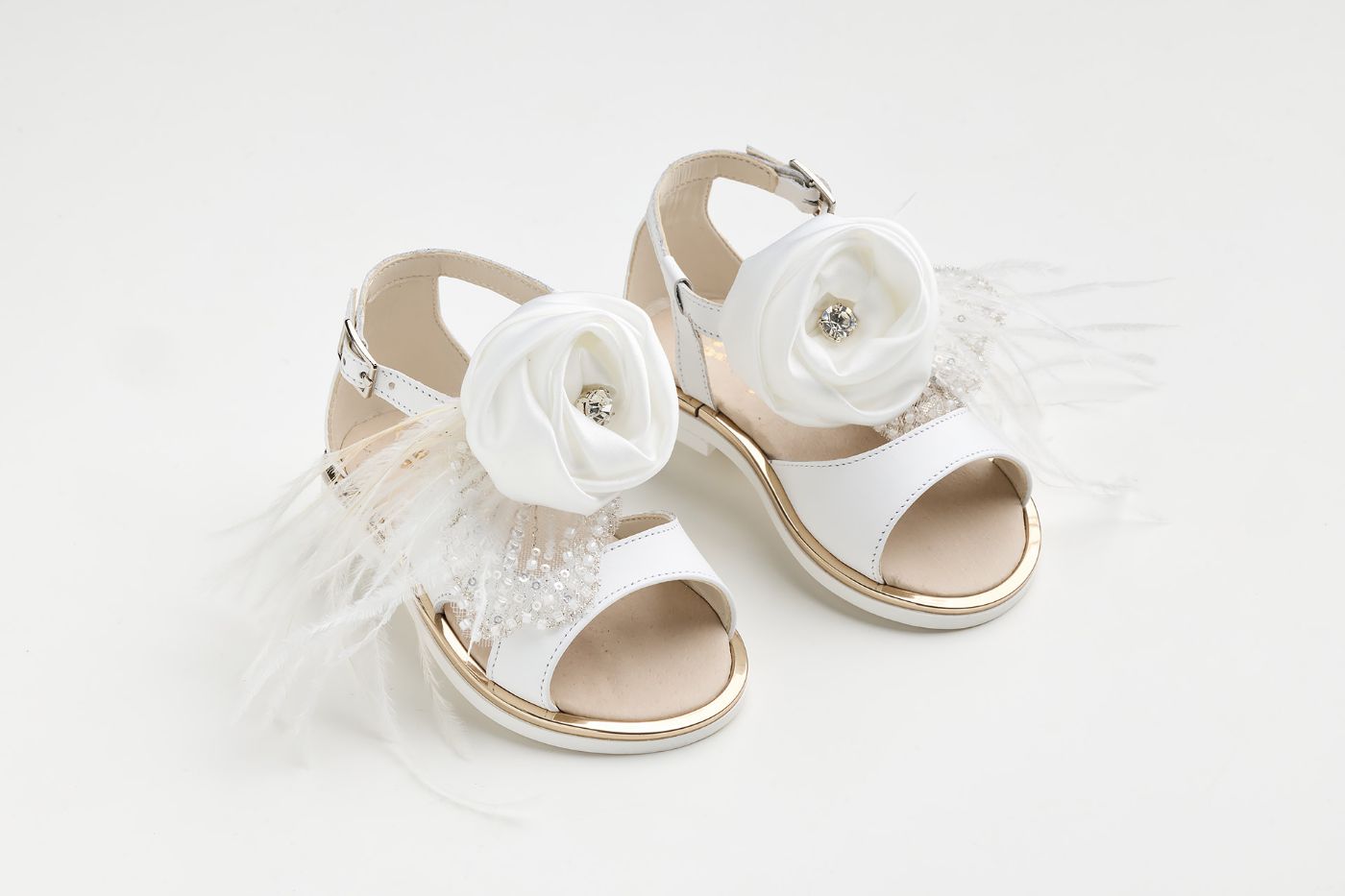 KE12 - Σανδάλι περπατήματος σε λευκό δέρμα με χειροποίητο διακοσμητικό λουλούδι με στρας, τούλι κεντητό με παγιέτες και φτερά