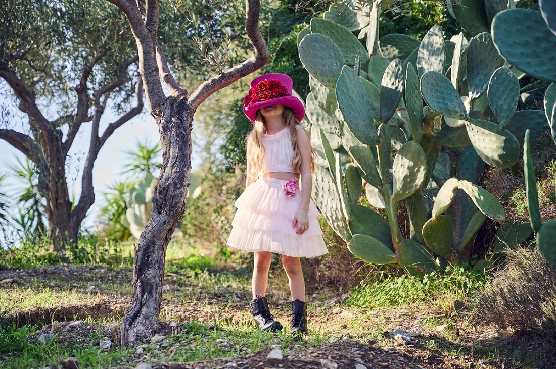 Βαπτιστικό two-piece σετ το οποίο διαθέτει φούστα από πολλαπλές στρώσεις τούλι με ένα πανέμορφο χειροποίητο λουλούδι και ένα εντυπωσιακό αμάνικο μπουστάκι που στο λαιμό έχει βολανάκι με γκλίτερ. Το σετ περιλαμβάνει ασορτί μπαντάνα/κορδέλα για τα μαλλιά με τον ίδιο στολισμό.