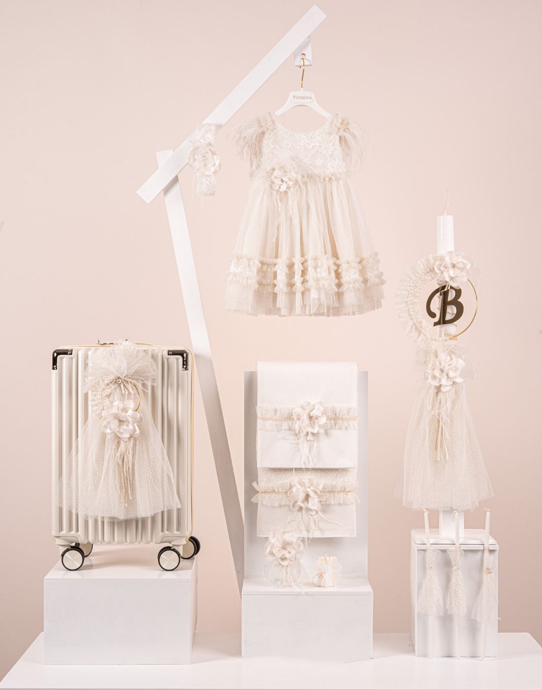 Ολοκληρωμένο σετ βάπτισης Piccolino σε Ivory απόχρωση με φόρεμα, στολισμένη βαλίτσα & λαμπάδα με το αρχικό γράμμα της επιλογής σας.