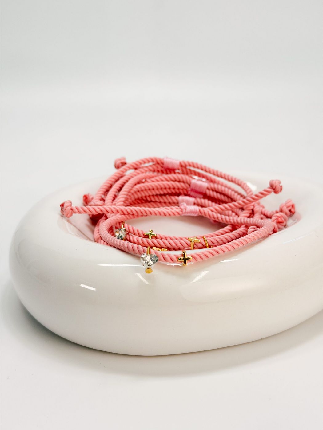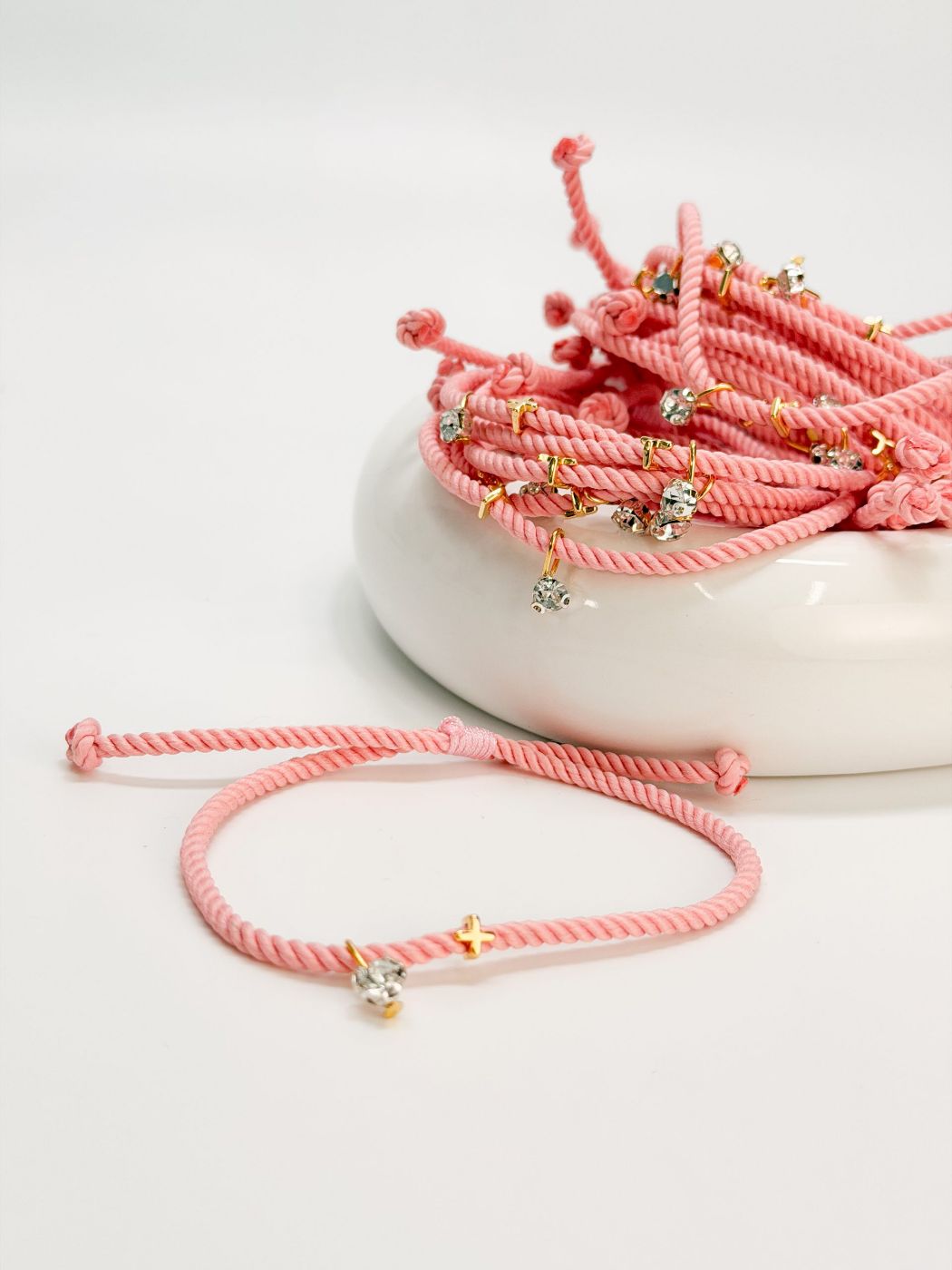 Γλυκά και μοντέρνα μαρτυρικά βάπτισης από τη συλλογή Celfie & Co και το Day Dream Events. Αυτά τα κομψά ροζ βραχιόλια είναι το ιδανικό αναμνηστικό δώρο για τους καλεσμένους σας, συνδυάζοντας το παραδοσιακό με το σύγχρονο στυλ.Κάθε βραχιόλι είναι φτιαγμένο με ανθεκτικό, ροζ βαμβακερό κορδόνι και διαθέτει έναν μικρό, επιχρυσωμένο σταυρό, καθώς και ένα γοητευτικό στοιχείο καρδιάς με κρύσταλλο. Είναι ρυθμιζόμενα (μακραμέ δέσιμο) για να ταιριάζουν σε όλα τα μεγέθη και αποτελούν ένα δώρο που οι καλεσμένοι θα χαρούν να φορέσουν.