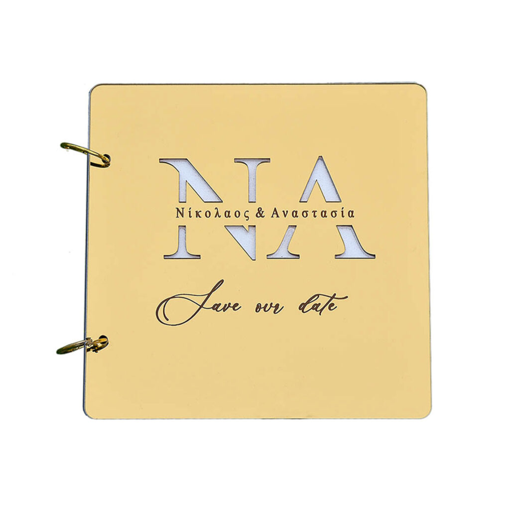 Χειροποίητο βιβλίο ευχών 'Save our date' από plexiglass καθρέπτη σε χρυσή απόχρωση. (στα σχόλια της παραγγελίας να αναγράφεται ημερομηνία καθώς και τα ονόματα του ζευγαριού)