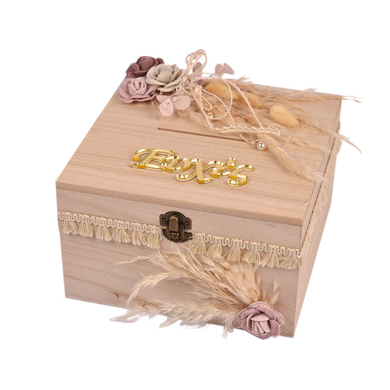 Ένα κουτί γεμάτο όμορφες ευχές που θα κρατήσετε για πάντα! Αυτό το χειροποίητο ξύλινο κουτί ευχών  συνδυάζει τη φυσική ομορφιά του ξύλου με ρομαντικές boho λεπτομέρειες, αποτελώντας το τέλειο ενθύμιο για τον γάμο σας. Είναι στολισμένο με pampas grass, δαντέλα, λινάτσα και υφασμάτινα τριαντάφυλλα σε αποχρώσεις του dusty pink και του μπεζ. Στο καπάκι δεσπόζει η χρυσή επιγραφή 'Ευχές' προσθέτοντας μια λάμψη πολυτέλειας στη rustic αισθητική του (τα οποία δεν περιλαμβάνονται στην τιμή)
