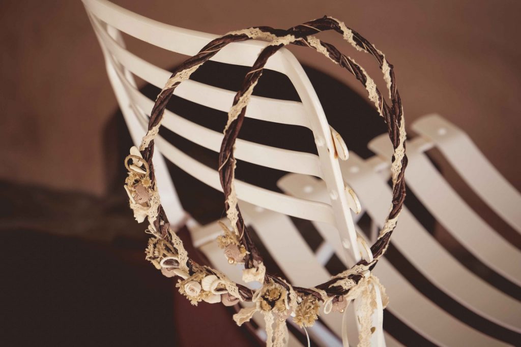 Επεξεργασμένο  κλαδί (όχι φυσικό) διακοσμημένο με μπεζ δαντέλα και στο πίσω μέρος με μπουκέτο απο πορσελάνη, μικρά αποξηραμένα λουλουδάκια αλλά και υφασμάτινα.