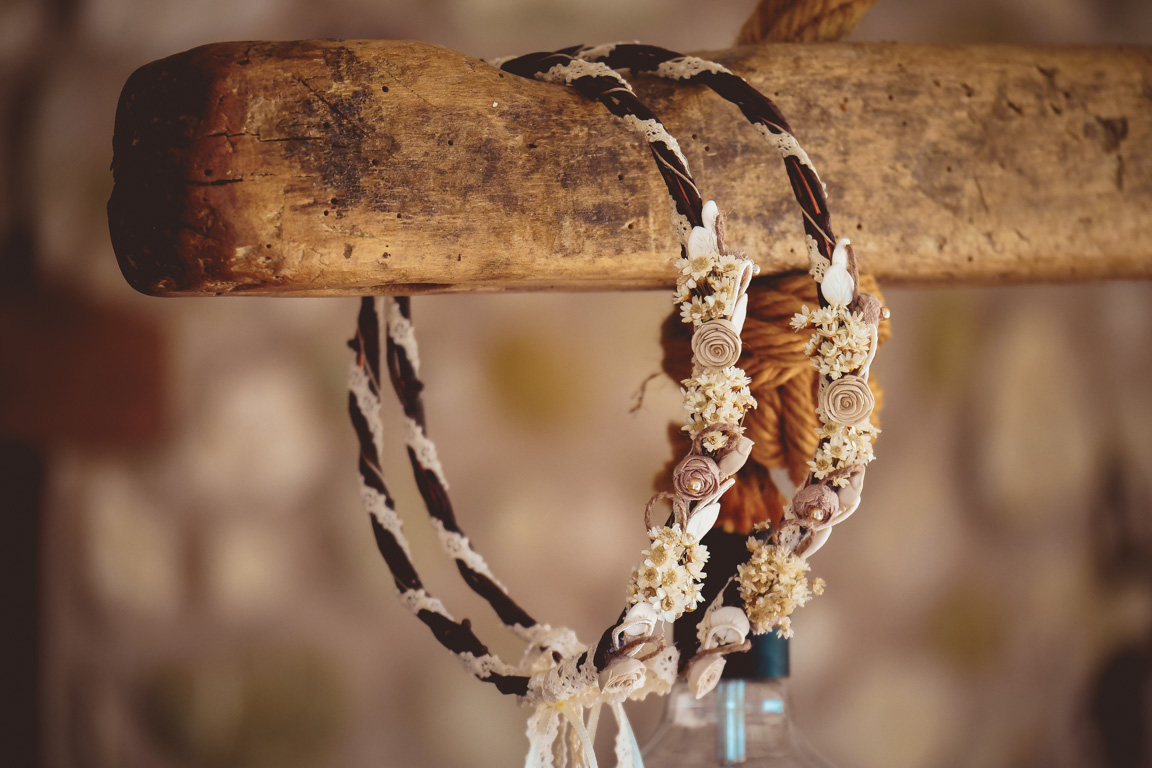 Ξύλινα στέφανα γάμου με μπουκέτο πορσελάνης στο πίσω μέρος