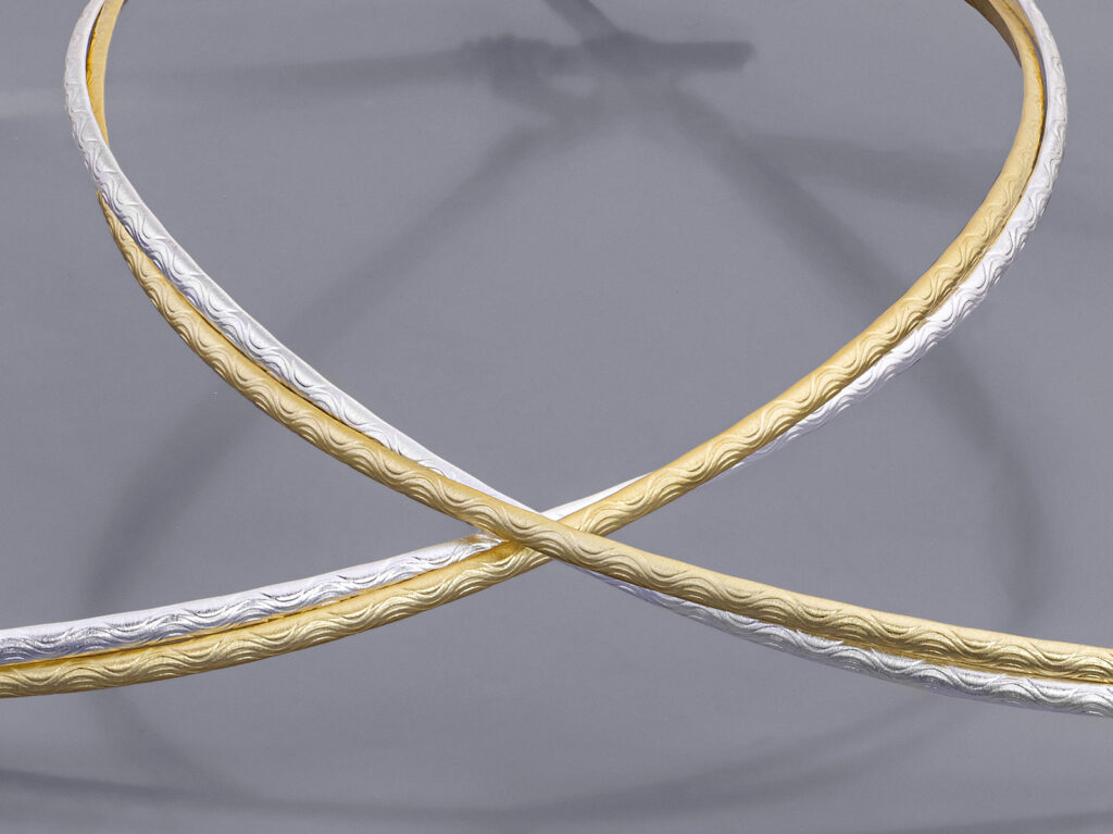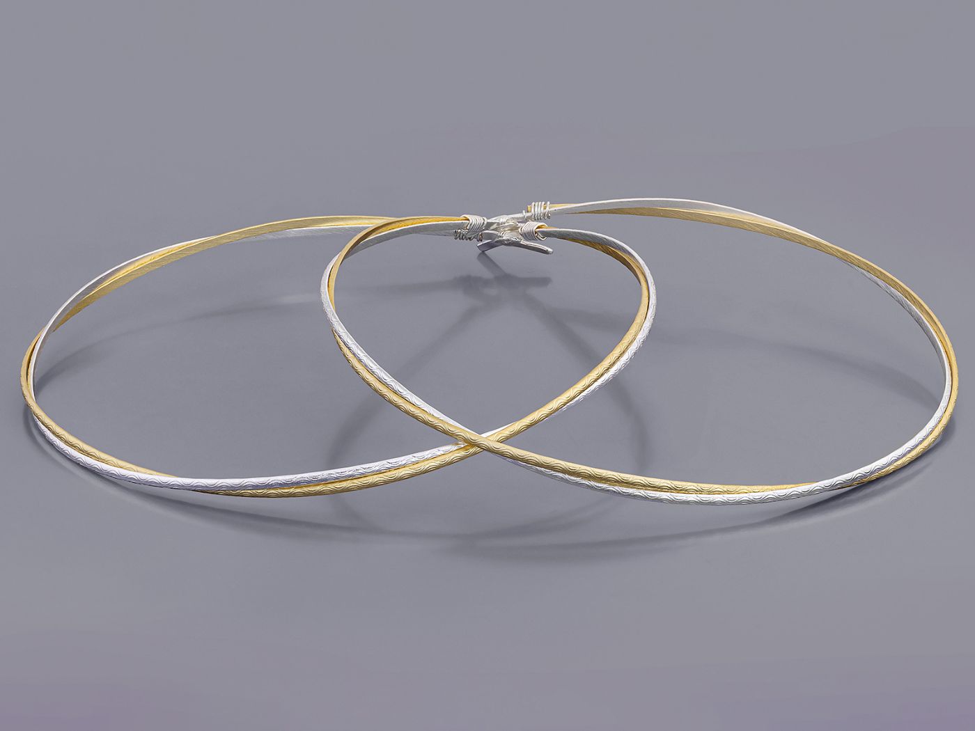 Εντυπωσιακό σετ στεφάνων που αποτελείται από δύο λεπτές, κυλινδρικές βέργες μπλεγμένες μεταξύ τους. Η μία βέργα διαθέτει επάργυρο/ασημένιο φινίρισμα με διακριτική ανάγλυφη υφή (σαγρέ ή διαμανταριστή), ενώ η δεύτερη είναι επίχρυση με λεία, γυαλιστερή επιφάνεια.