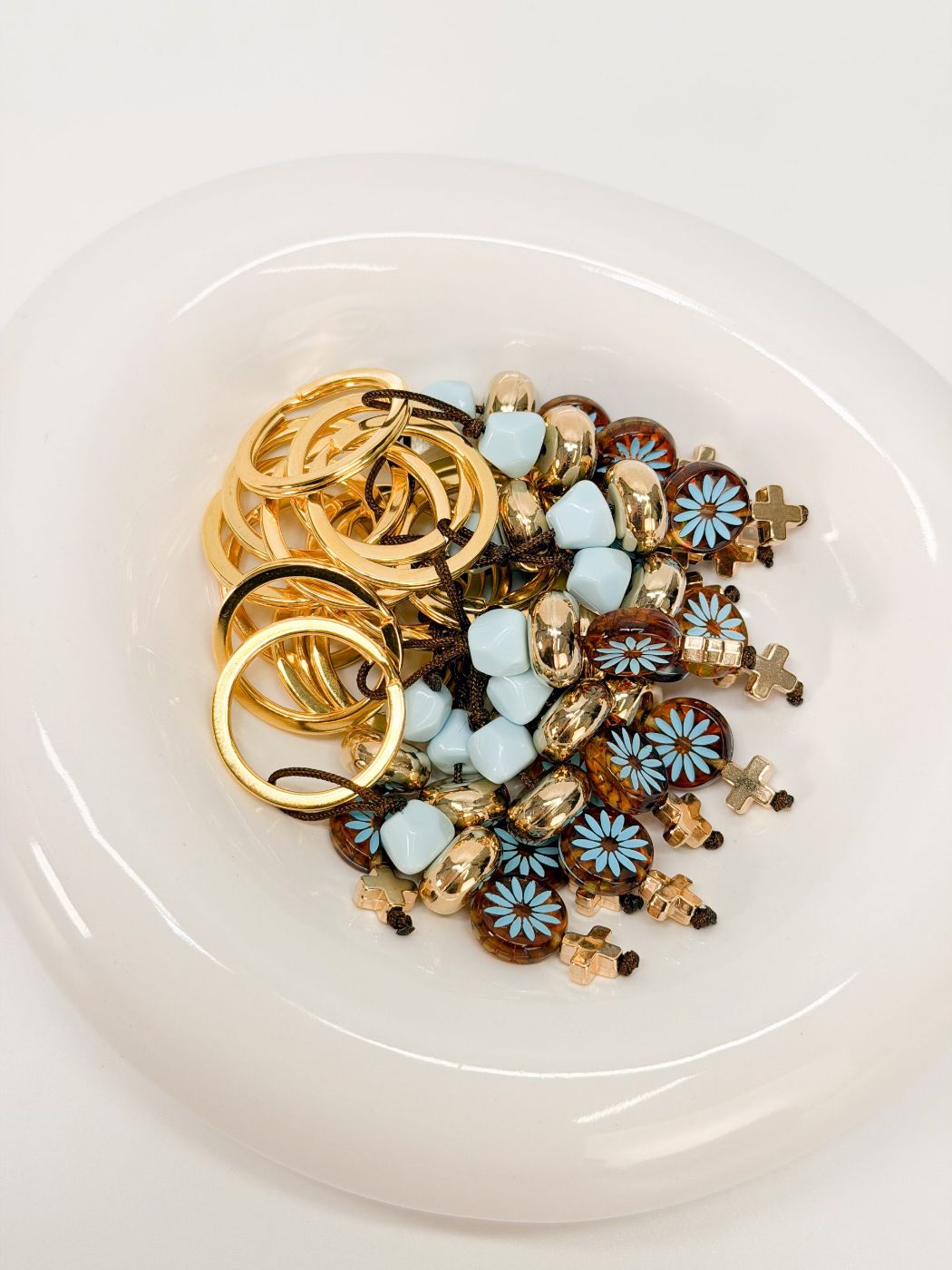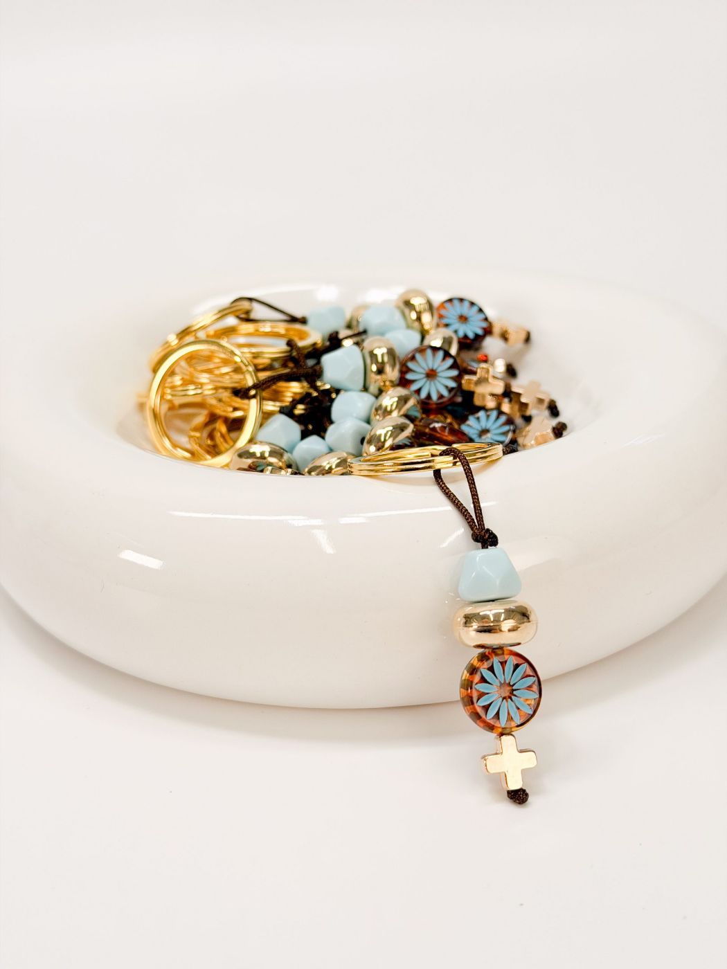 Μαρτυρικό μπρελόκ με καφέ κορδόνι, γαλάζια ακρυλική χάντρα, χρυσή ροδέλα μεγάλη, ακρυλική στρογγυλή χάντρα με λουλούδι σε καφέ και γαλάζια απόχρωση και ακρυλικό σταυρό.
